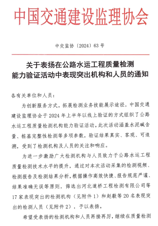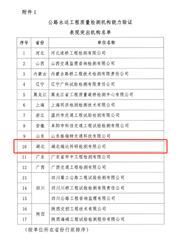 近日,中國交通建設(shè)監(jiān)理協(xié)會(huì)發(fā)布《關(guān)于表揚(yáng)在公路水運(yùn)工程質(zhì)量檢測(cè)能力驗(yàn)證活動(dòng)中表現(xiàn)突出機(jī)構(gòu)和人員的通知》,湖北路橋旗下的瑞達(dá)檢測(cè)公司榮獲“表現(xiàn)突出機(jī)構(gòu)”稱號(hào),且是湖北省內(nèi)唯一獲得表彰的檢測(cè)單位。