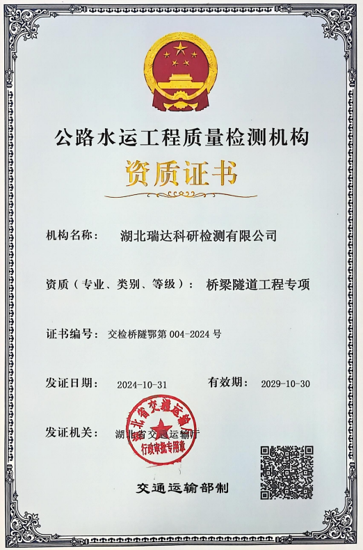 經(jīng)湖北省交通運(yùn)輸廳批準(zhǔn),湖北路橋瑞達(dá)科研檢測公司成功取得公路工程橋梁隧道工程專項資質(zhì),成為全省第5家取得該資質(zhì)的檢測機(jī)構(gòu),資質(zhì)實(shí)力達(dá)到了新高度。
